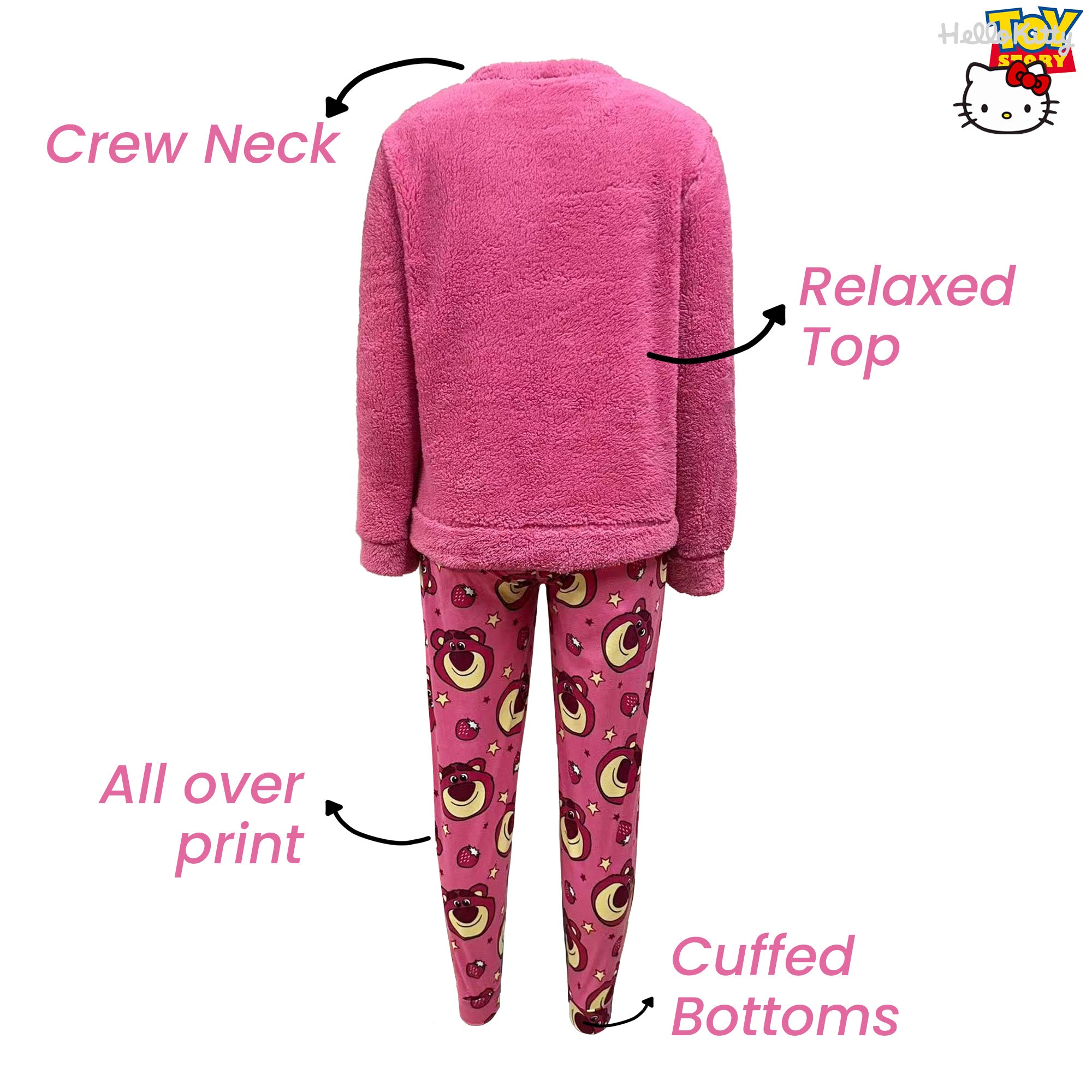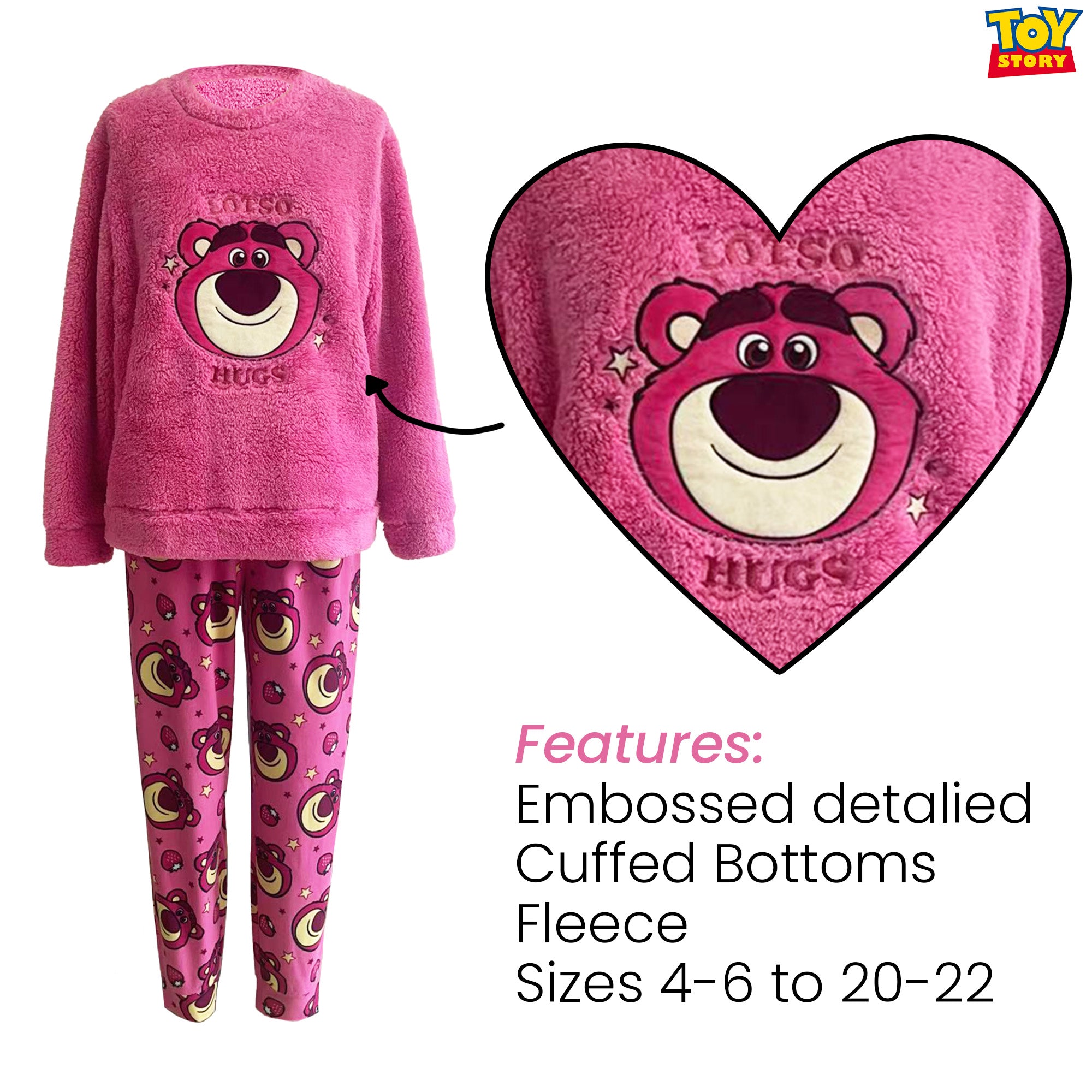 - VERSATILE WEAR: This fleece pyjama set isn’t just for bedtime – it’s designed to be your go-to loungewear for a variety of occasions. Whether you’re curling up with a movie, enjoying a lazy Sunday, hosting a sleepover, or simply staying warm around the house, this Lotso set combines both comfort and style. The fun design also makes it a great choice for themed events, pyjama parties, or as a cozy outfit when traveling.