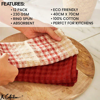 K Collection Red 12 Pack Check Kitchen Towels Set - 100% Ring Spun Cotton - Terry Check Design