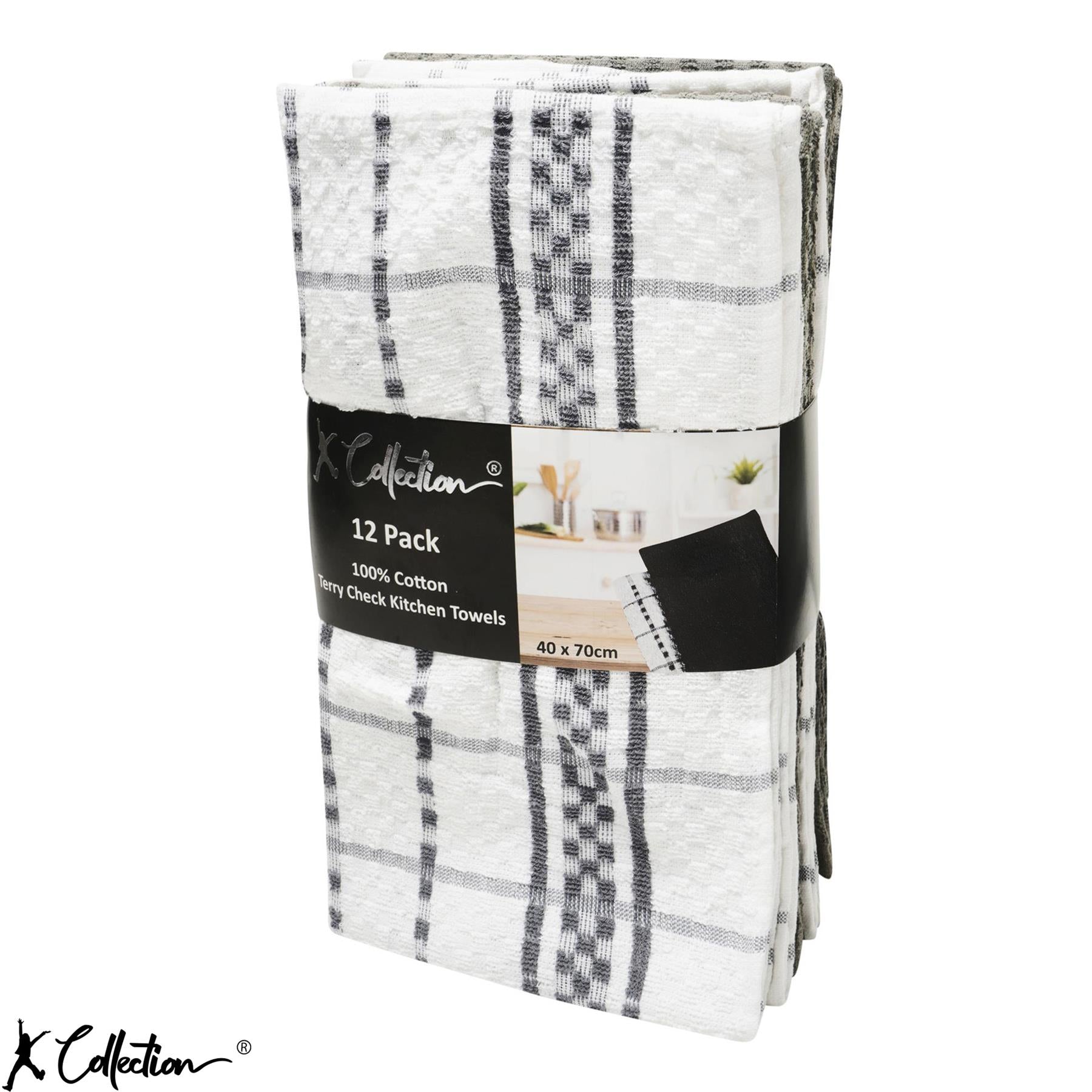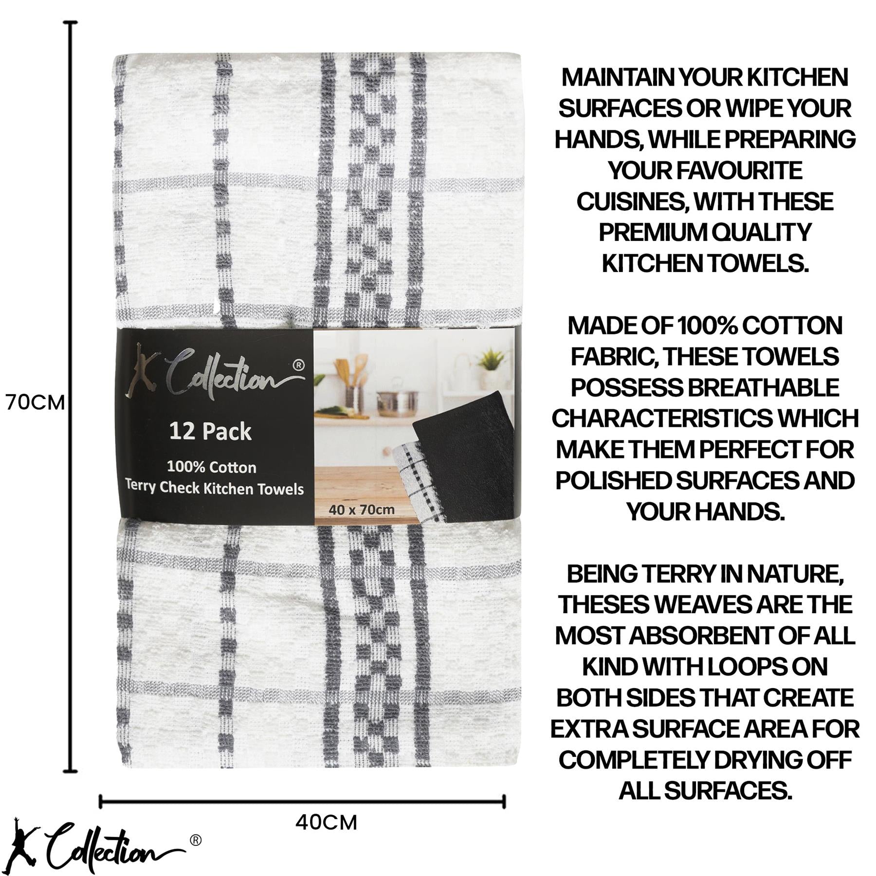 K Collection Grey 12 Pack Check Kitchen Towels Set - 100% Ring Spun Cotton - Terry Check Design