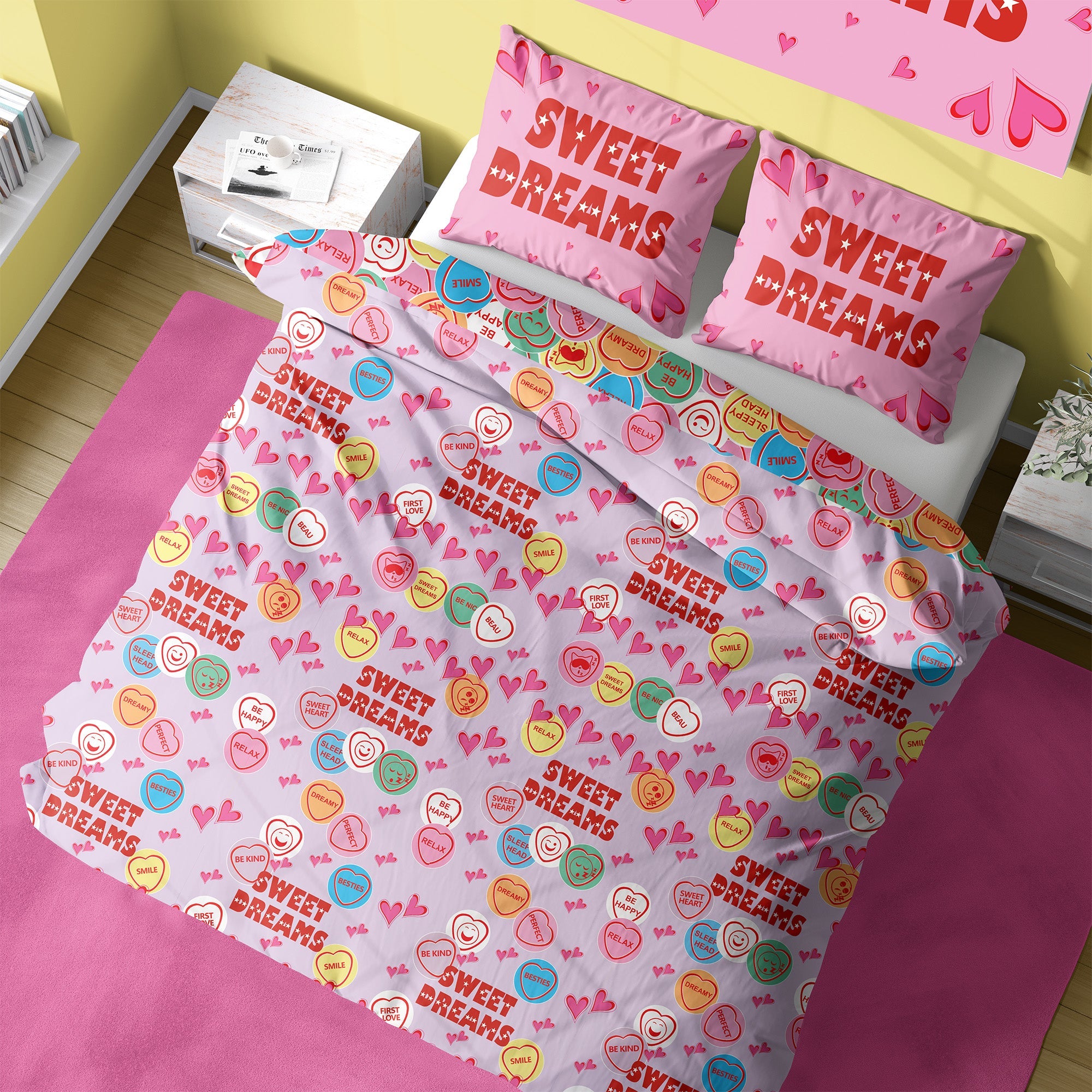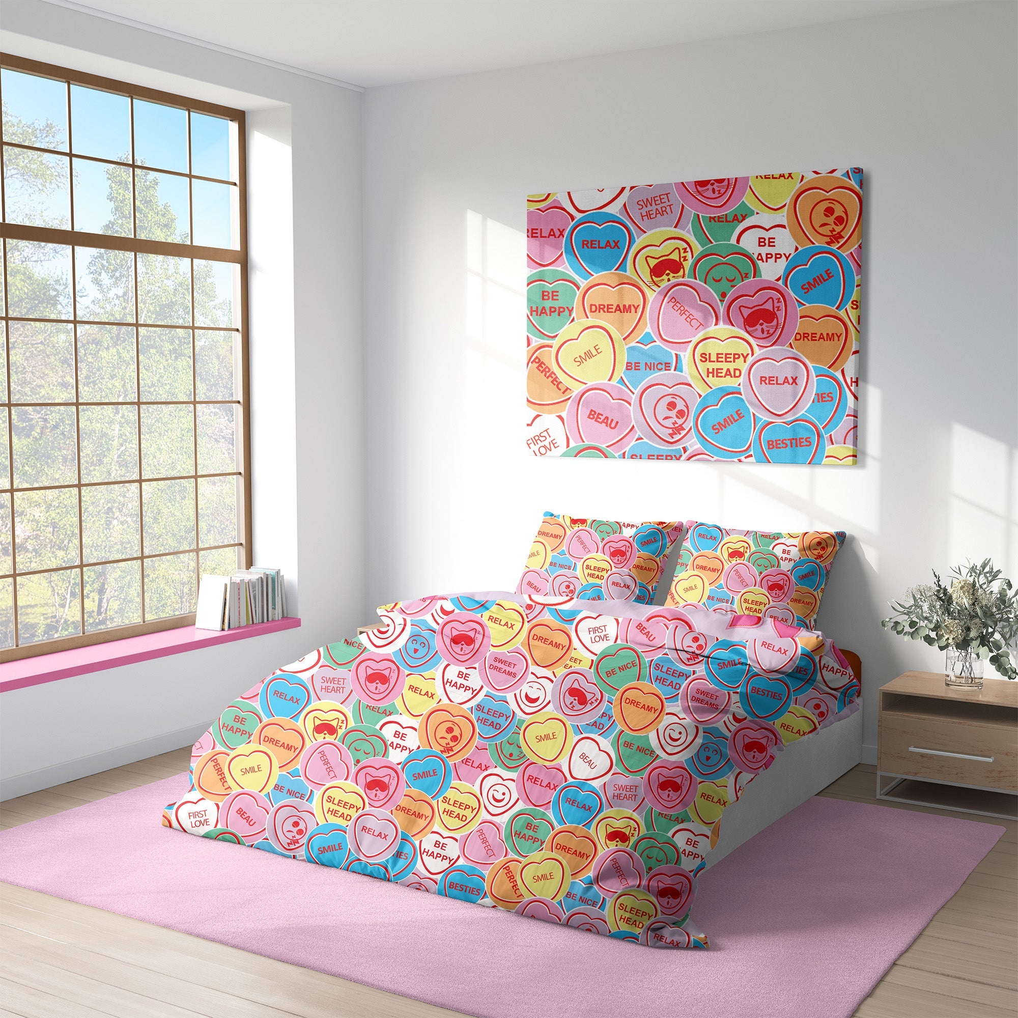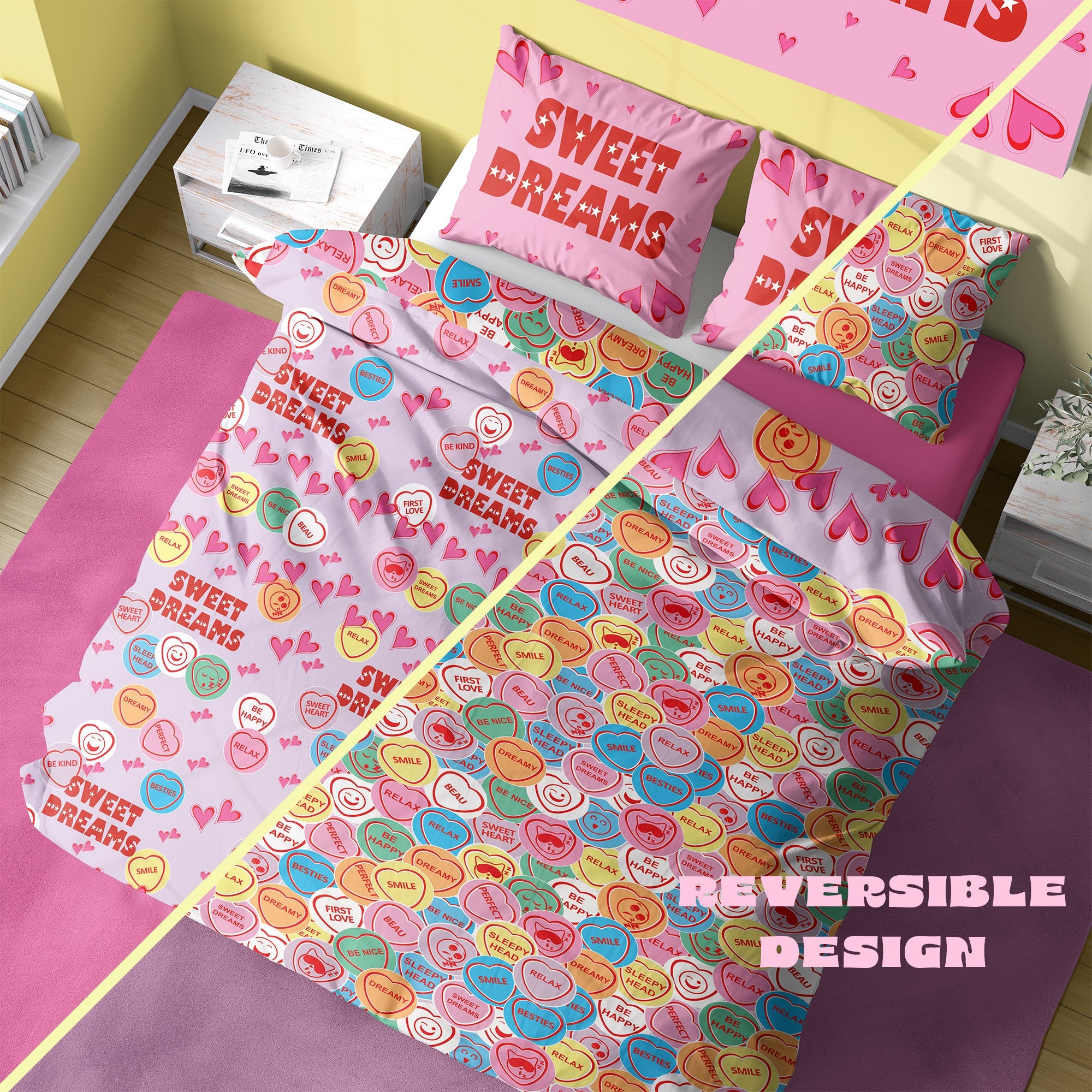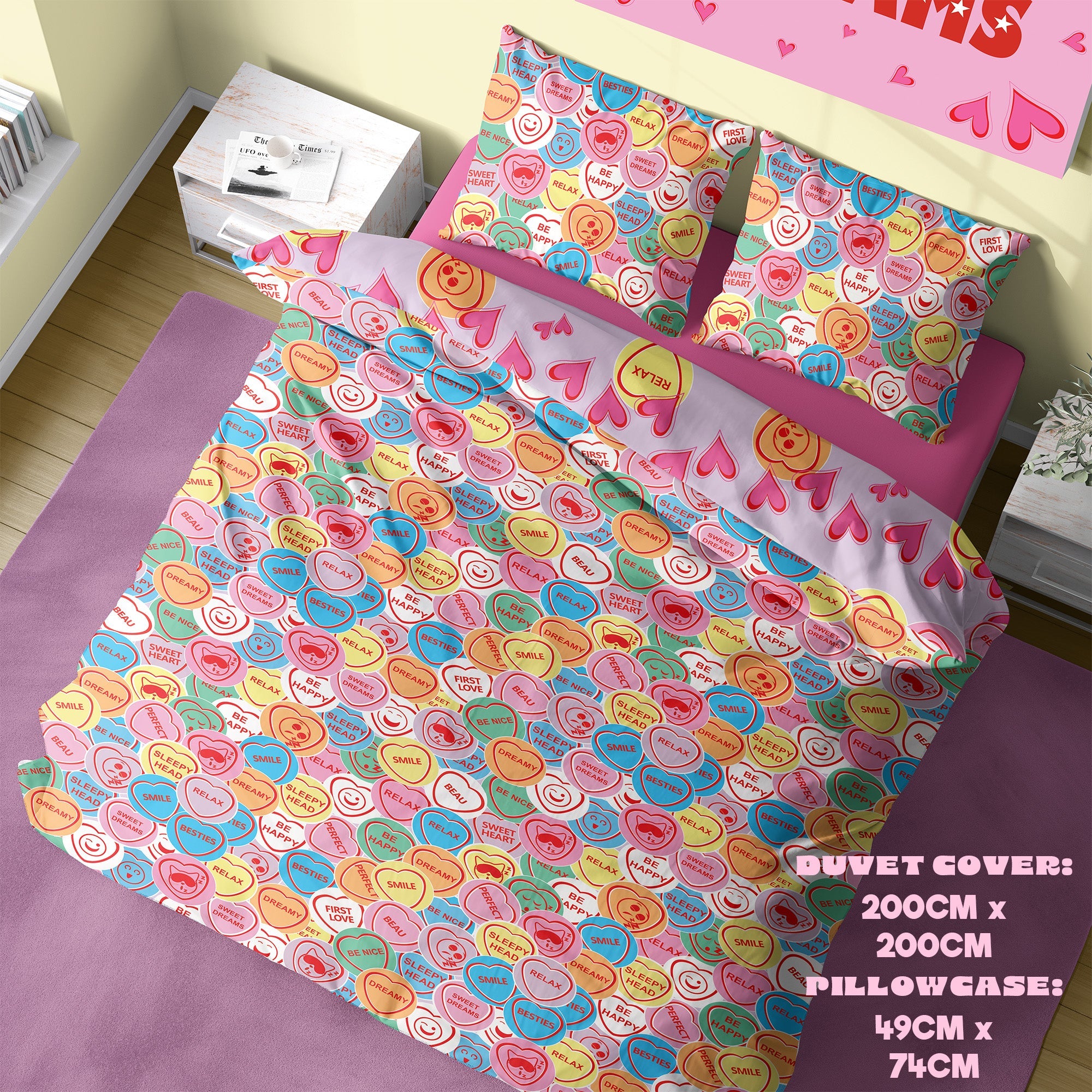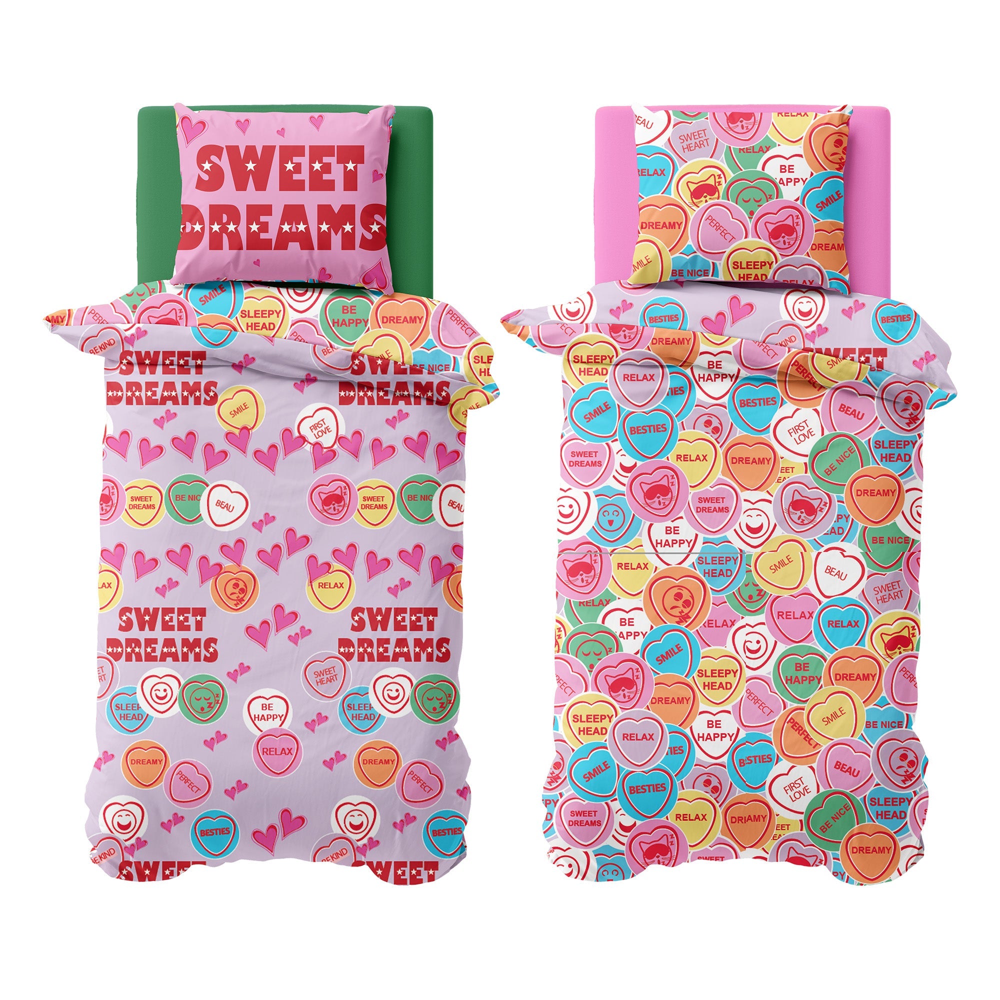 • Transform your bedroom with this fun and vibrant Sweetheart-themed duvet set, featuring uplifting messages like “Be Happy,” “Relax,” and “Dreamy.” The reversible design offers two unique looks: one side shows soft pastel tones with heart illustrations and “Sweet Dreams” lettering, while the reverse features an all-over pattern of colourful conversation heart candies. Ideal for kids, teens, or anyone who loves playful, positive bedding.