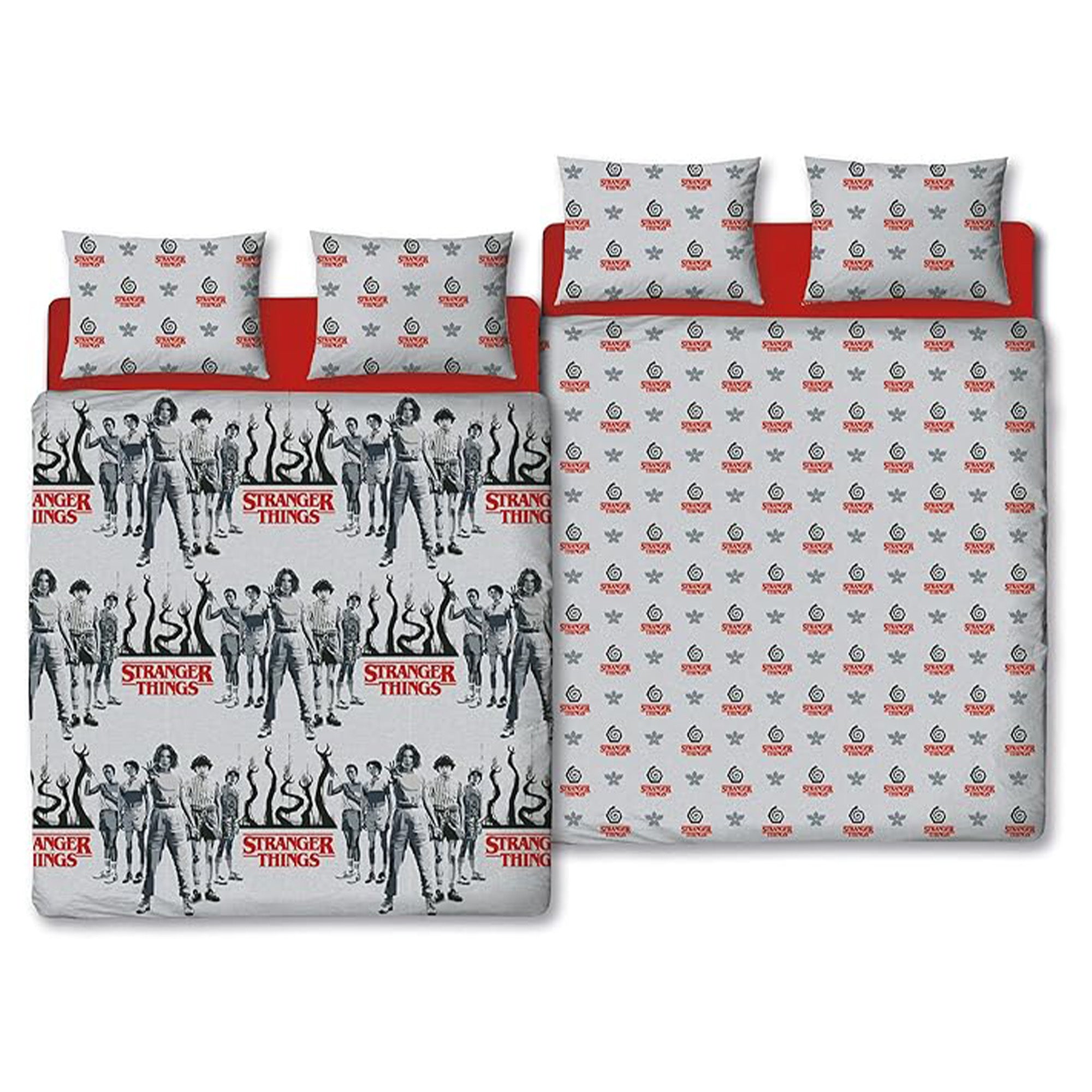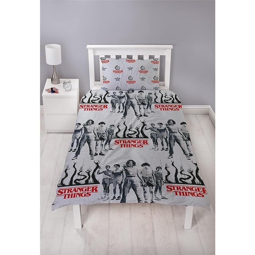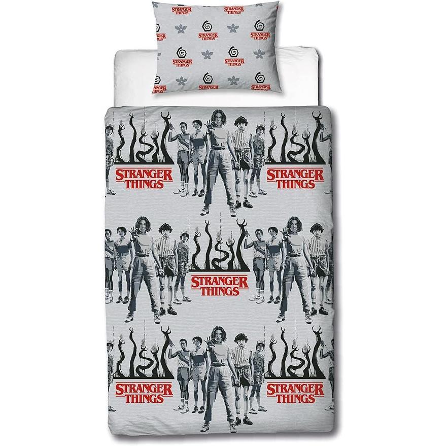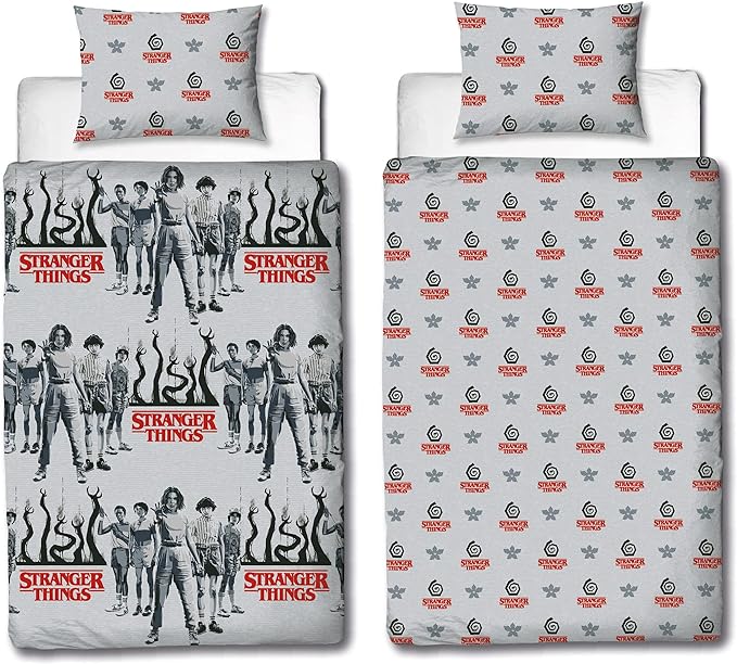This fantastic Stranger Things single duvet cover is perfect for any fans of the popular Netflix show. Part of the official Stranger Things range, the design features the shows main cast and iconic logo. The reverse has the Stranger Things logo in a smaller repeat pattern on a grey background