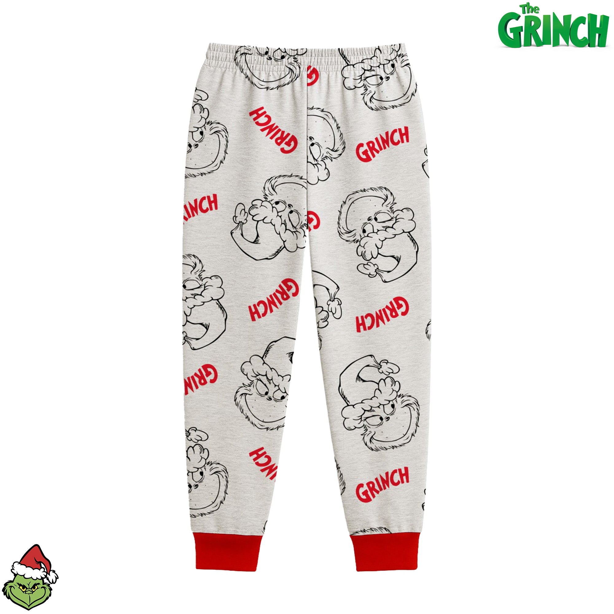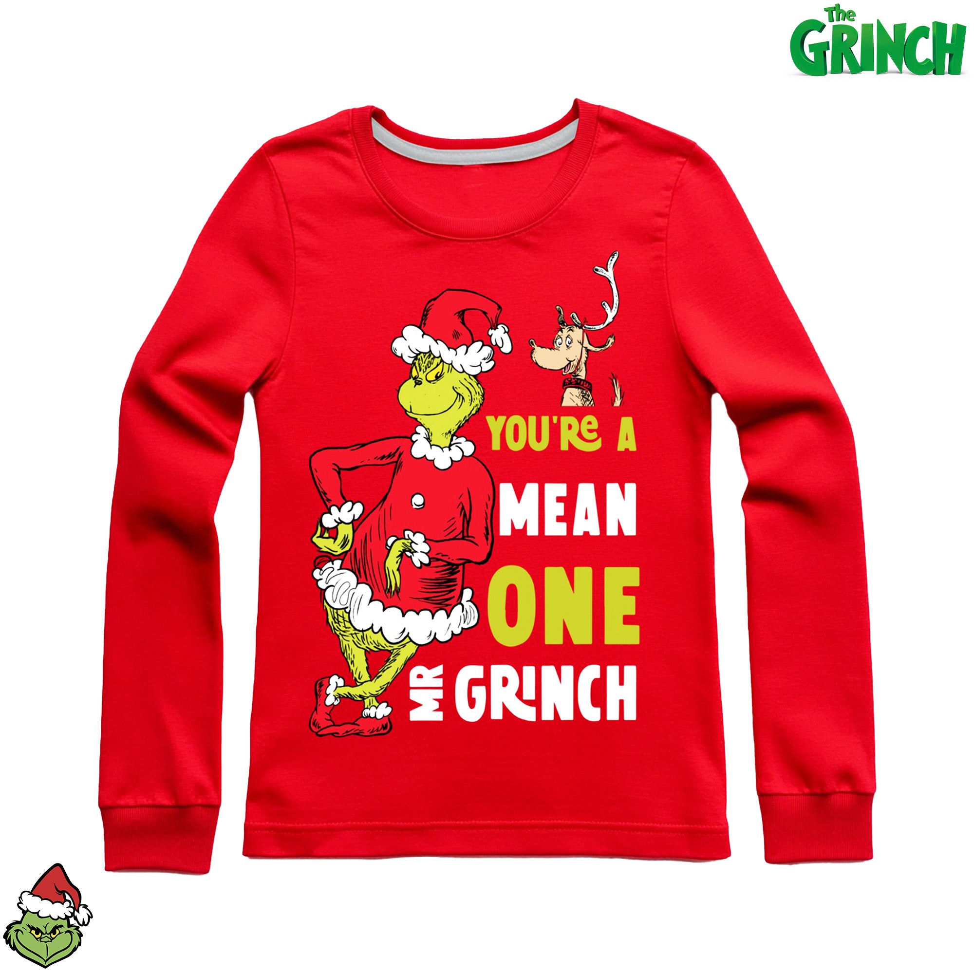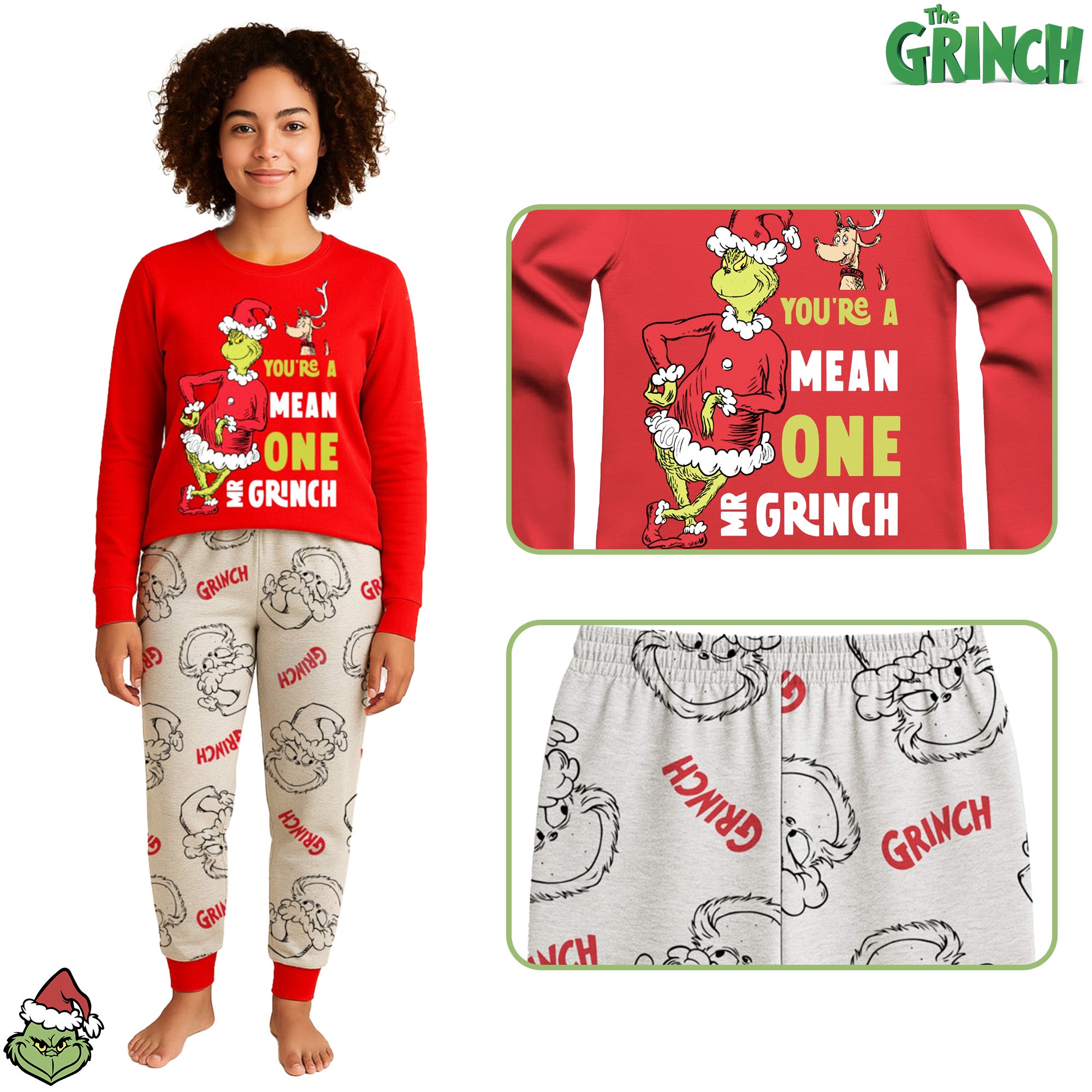 • Embrace the holiday spirit with our charming Grinch pyjamas! The set includes a vibrant red long sleeve top featuring the iconic quote "You're a Mean One Mr. Grinch" alongside fun graphics of the Grinch and Max. The matching jogger-style bottoms are light grey with an all-over Grinch face print and red logos—playful, cozy, and full of character.