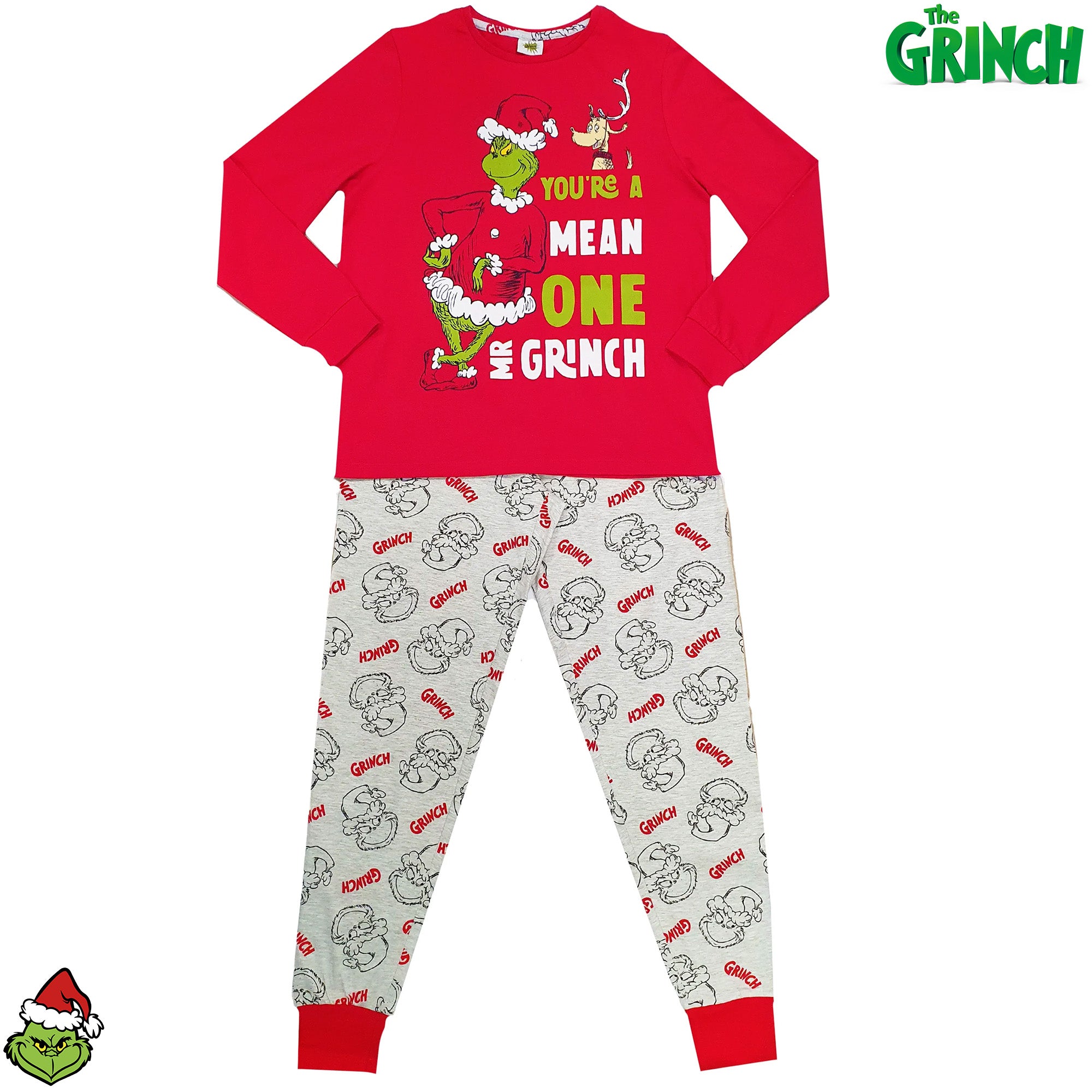 Embrace the holiday spirit with our charming Grinch pyjamas! The set includes a vibrant red long sleeve top featuring the iconic quote "You're a Mean One Mr. Grinch" alongside fun graphics of the Grinch and Max. The matching jogger-style bottoms are light grey with an all-over Grinch face print and red logos—playful, cozy, and full of character.